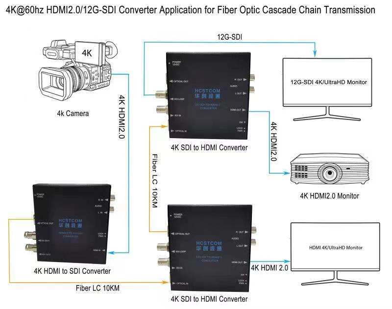 The HDMI 2.0 to 12G-SDI converter produced by Beijing HCSTCOM Co.,Ltd converts HDMI2.0 signals to12G-SDI,Achieving 4K/UHD single link output. It includes2-ch 12G-SDI distributed amplifier outputs. Supports 1 SFP optical port output,Supports transmission of HDMI 4K/ UHD signal up to10-80km through single-mode single-fiber. Supports 2-channels of embedded audio from an HDMI source or two-channel analog audio (RCA) input. It can be used together with our 12G-SDI fiber receiver as HDMI input and SDI output fiber extender