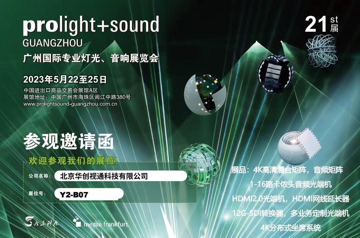 2023年第21屆廣州國(guó)際專業(yè)燈光,音響展覽會(huì) ;地點(diǎn):廣交會(huì)展館A區(qū),Y2-B07 時(shí)間:5月22至25日 主營(yíng)產(chǎn)品:4k HDMI光端機(jī),HDMI2.0網(wǎng)線延長(zhǎng)器,HDMI 2.0光釬線,HDbaseT網(wǎng)線延長(zhǎng)器;4K分布式KV