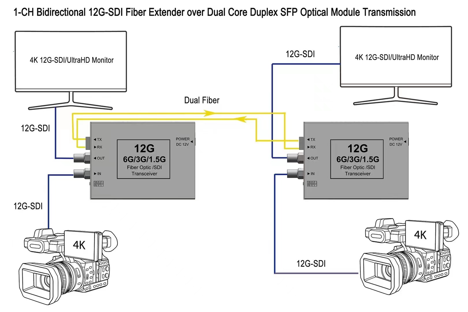 單臺(tái)設(shè)備支持1路12G-SDI轉(zhuǎn)LC單模光釬輸出,支持1路LC光釬輸入轉(zhuǎn)換成12G-SDI;