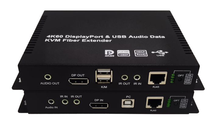 北京華創(chuàng)視通研發(fā)生產(chǎn)的4K60 DP KVM網(wǎng)線(xiàn)延長(zhǎng)器,可通過(guò)6類(lèi)(CAT6)或6類(lèi)以上網(wǎng)線(xiàn)(CAT6A/7)產(chǎn)品支持點(diǎn)對(duì)點(diǎn)的連接方式,支持1路DP1.2視頻,1路3.5音頻,1路雙向紅外線(xiàn)傳輸,1路RS232雙向數(shù)據(jù),以及1路USB鍵盤(pán)鼠標(biāo)的KVM功能,可以通過(guò)USB鼠標(biāo)、鍵盤(pán)實(shí)現(xiàn)遠(yuǎn)程控制與管理,主要應(yīng)用于戶(hù)外廣告、投影融合、指揮中心KVM、研發(fā)保密系統(tǒng)及遠(yuǎn)程會(huì)議等。